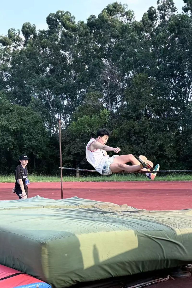 跳高运动员们目光锁定横杆,助跑、起跳、过杆,动作连贯,稳稳落地。