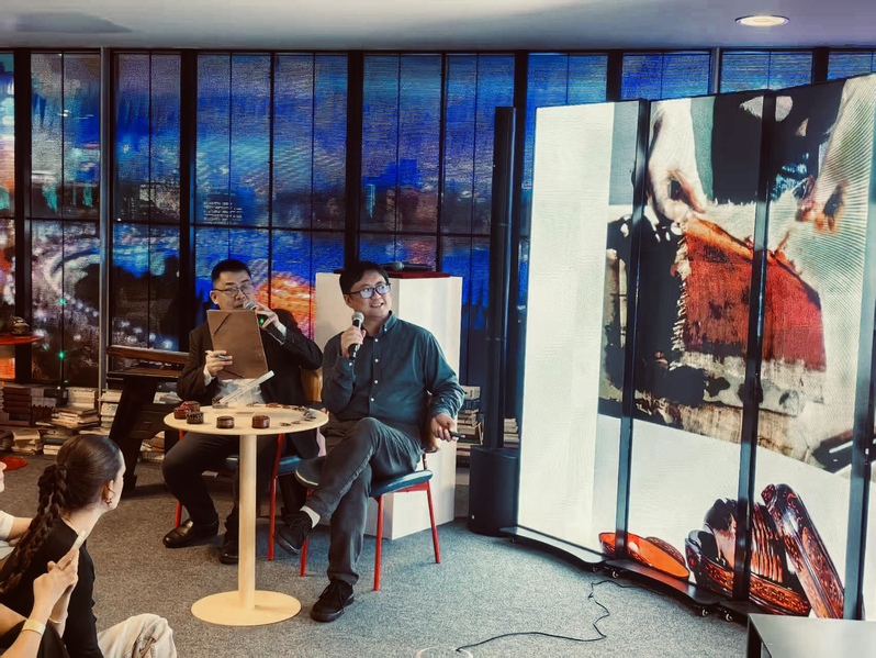 金晖院长首先以“大漆与亚洲文明”为题,梳理大漆从河姆渡文化的朱漆木碗到战国秦汉的“黄金时代”,从唐代的东传到17、18世纪的“海上丝绸”之路西传,漆艺深刻影响亚洲物质文化和欧洲装饰艺术的发展,诠释了大漆为何被誉为“亚洲文化的基因”。随后,刘雪山结合《又见山海》系列创作,分享创作灵感和创作过程。通过讲解和交流,在场观众一方面认识到“漆”这一源自中国的材料如何成为世界性的艺术语言;另一方面,也看到中国艺术家在当代语境下对传统漆工艺的探索。